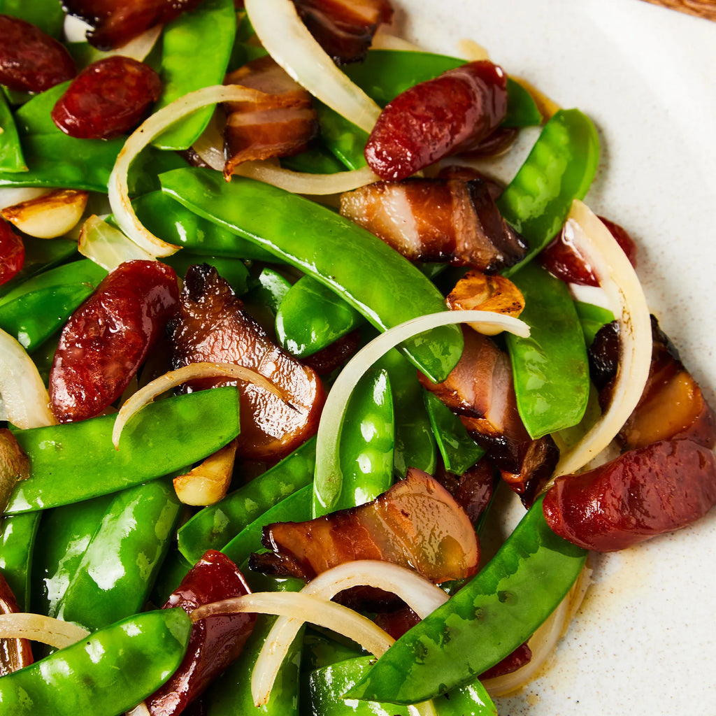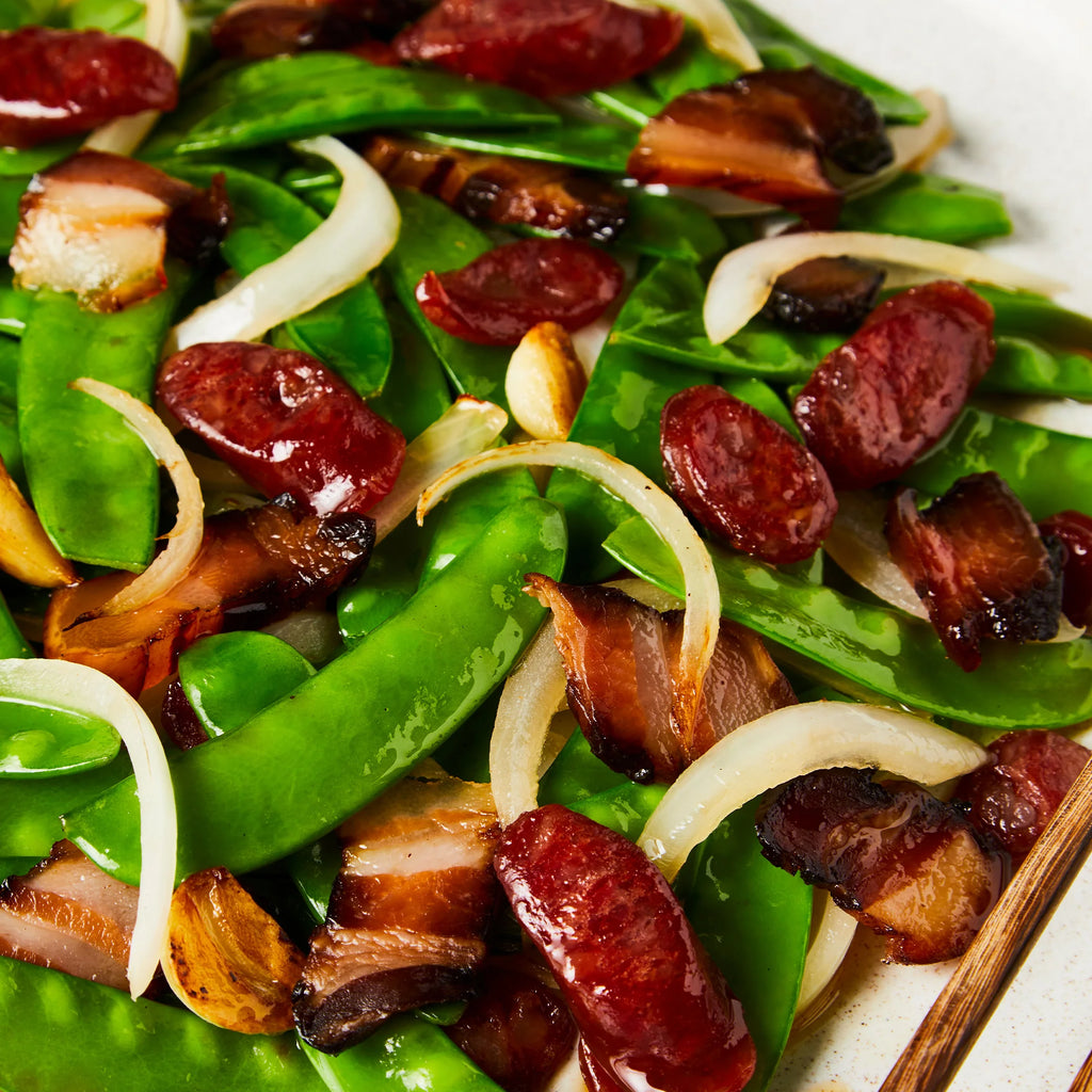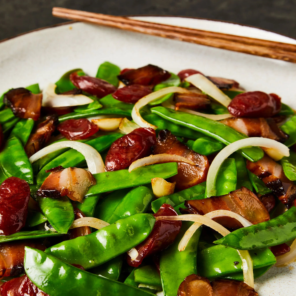 Snow Peas with Chinese Sausage and Chinese Bacon
